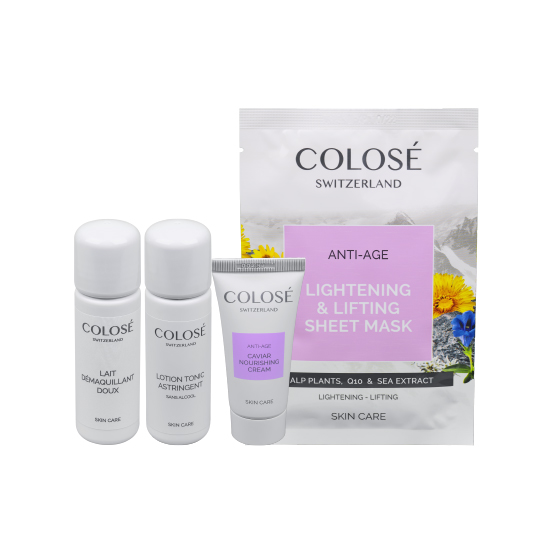 Reinigungsmilch (40 ml), Gesichtswasser (40 ml), Kaviar-Creme (15 ml) und Anti Aging-Tuchmaske.