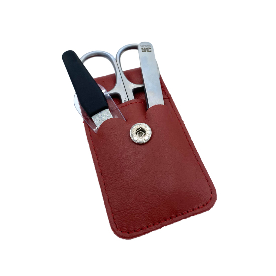 Unser praktisches Maniküre Set im eleganten, roten Ledertäschchen. Inklusive Nagelschere, Feile und Pinzette. Ideal für unterwegs!